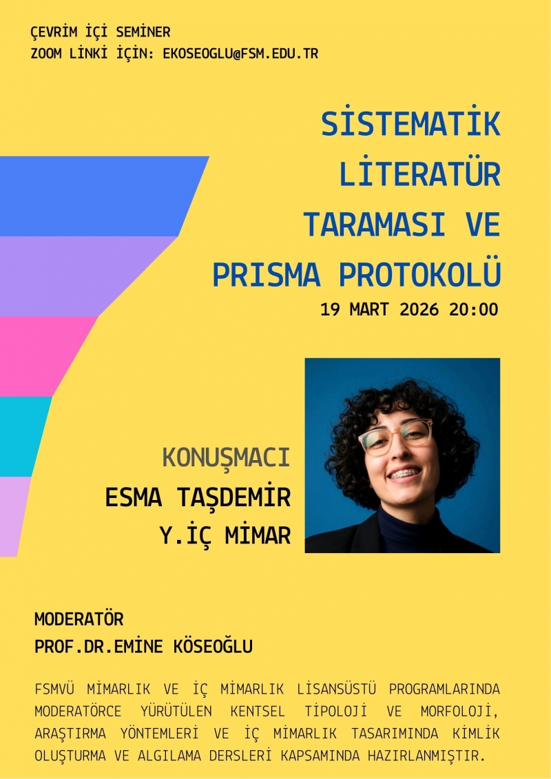 Bu seminerde sistematik literatür taraması ve Prisma protokolünün esasları ve uygulama biçimleri Y. İç Mimar Esma Taşdemir tarafından aktarılacaktır. Seminer herkese açıktır. Zoom linki için [email protected]adresine e-posta gönderiniz.