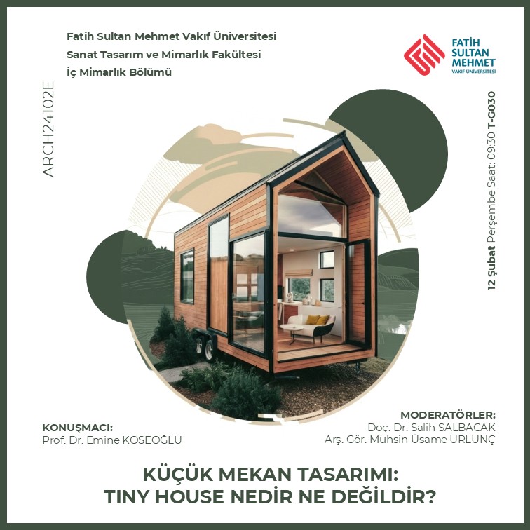 ARCH2410E Introductory Design Studio dersi kapsamında Prof. Dr. Emine KÖSEOĞLU tarafından "KÜÇÜK MEKAN TASARIMI: TINY HOUSE NEDİR NE DEĞİLDİR?" adlı seminer 12 Şubat 2026 Perşembe günü saat 09:30'da Topkapı Yerleşkesi T-G030 kodlu sınıfta yapılacaktır. Katılımlarınızı bekleriz.