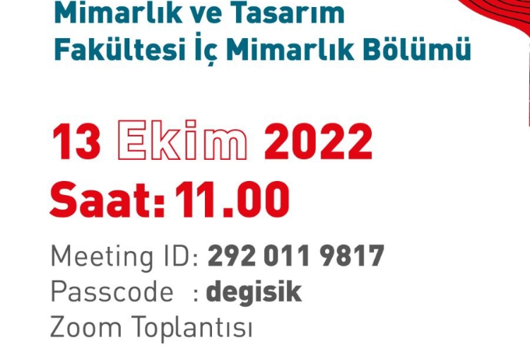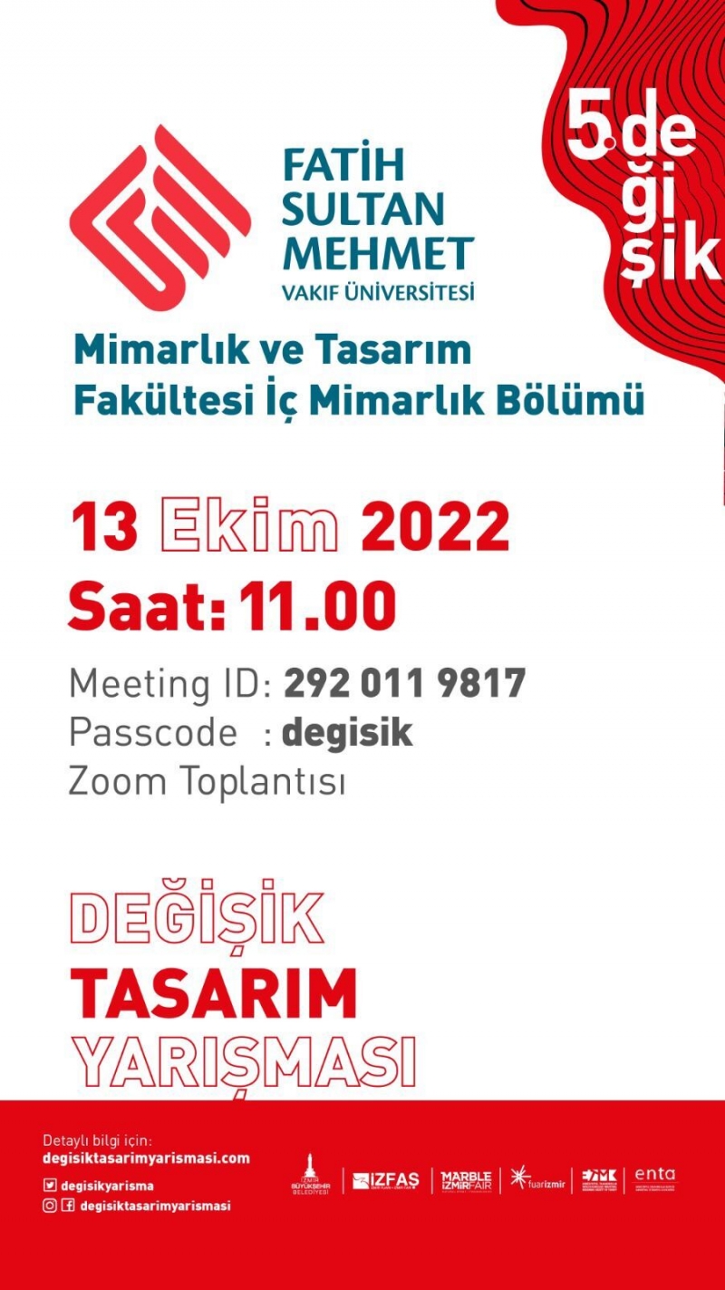 5. Doğal Taş Tasarım Yarışması bu sene "değişik" konsepti ile katılıma açılmıştır. Değişik Tasarım Yarışması ile ilgili bilgilendirme toplantısı 13 ekim 2022 perşembe günü saat 11:00'de çevrimiçi gerçekleşecektir. Zoom Toplantı Kimliği: 292 011 9817 Toplantı Şifresi: degisik. Tüm öğrencilerimizi toplantıya ve yarışmaya katılmaya davet ediyoruz. Yarışmaya ilişkin detaylı bilgi için: https://www.degisiktasarimyarismasi.com/