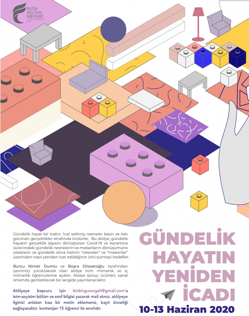 Fatih Sultan Mehmet Vakıf Üniversitesi Mimarlık ve Tasarım Fakültesi İç Mimarlık Bölümü Çevrimiçi Platformu kapsamında, Ar. Gör. Burcu Nimet Dumlu ve Ar. Gör. Büşra Dilaveroğlu tarafından 10-13 Haziran 2020 tarihleri arasında çevrimiçi yürütülecek olan atölye tüm mimarlık ve iç mimarlık öğrencilerine açıktır. Atölye sonuç ürünleri, sanal ortamda gezilebilecek bir sergide yayınlanacaktır.