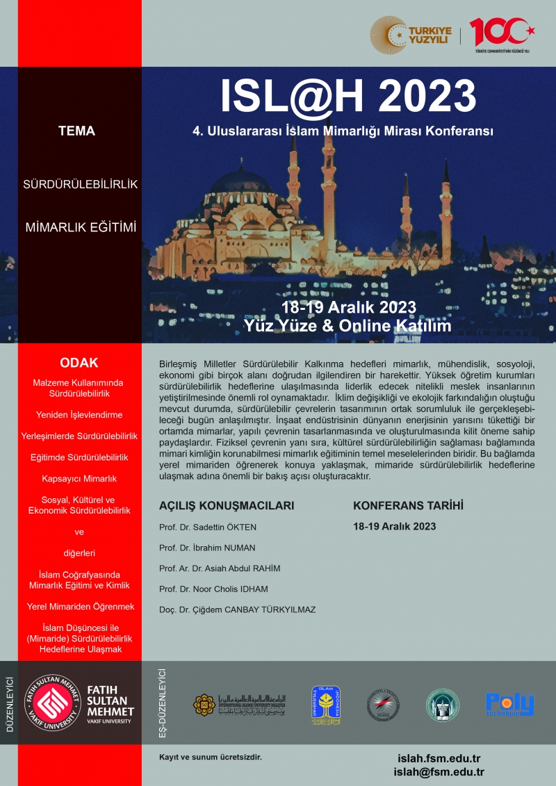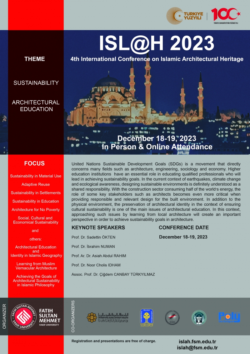 Fatih Sultan Mehmet Vakıf Üniversitesi Mimarlık ve Tasarım Fakültesi 2017 yılından bu yana, her iki yılda bir Uluslararası ISL@H (Islamic Architectural Heritage) Konferanslarını düzenlenmektedir. Bu yıl da 18-19 Aralık 2023 tarihlerinde, FSMVÜ ev sahipliğinde ve ortak üniversiteler; International Islamic University Malaysia, Universitas Islam Indonesia, University of Prishtina, Samarkand State Architectural and Civil Engineering Institute ve Ecole Polytechnique Sousse işbirliği ile 4. Uluslararası ISL@H Konferansı gerçekleştirilecektir.