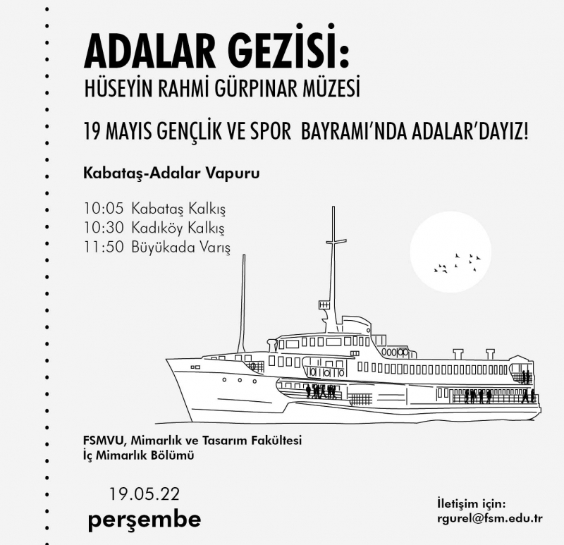 İç Mimarlık Bölümü 2021-2022 Bahar Dönemi Etkinlikleri kapsamında gerçekleşecek olan “Adalar Gezisi”ne öğrencilerimizin katılımını bekliyoruz. 19 mayıs Gençlik ve Spor Bayramı’nda yapılacak gezi kapsamında 10:05 Kabataş ve 10:30 Kadıköy kalkışlı vapur ile adalar gezilecektir. Duraklardan biri Heybeliada’daki Hüseyin Rahmi Gürpınar Müzesi olacaktır. Katılmak isteyen öğrenciler aşağıdaki linkten kayıt olabilir: