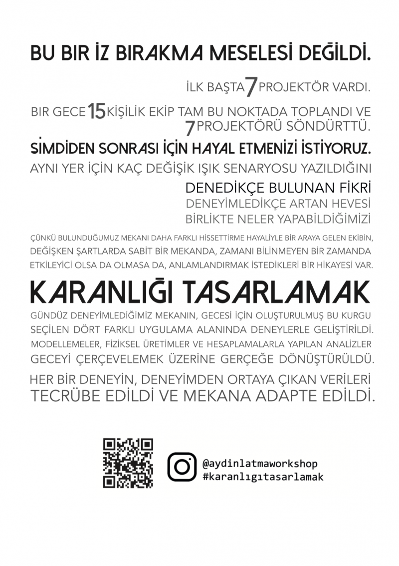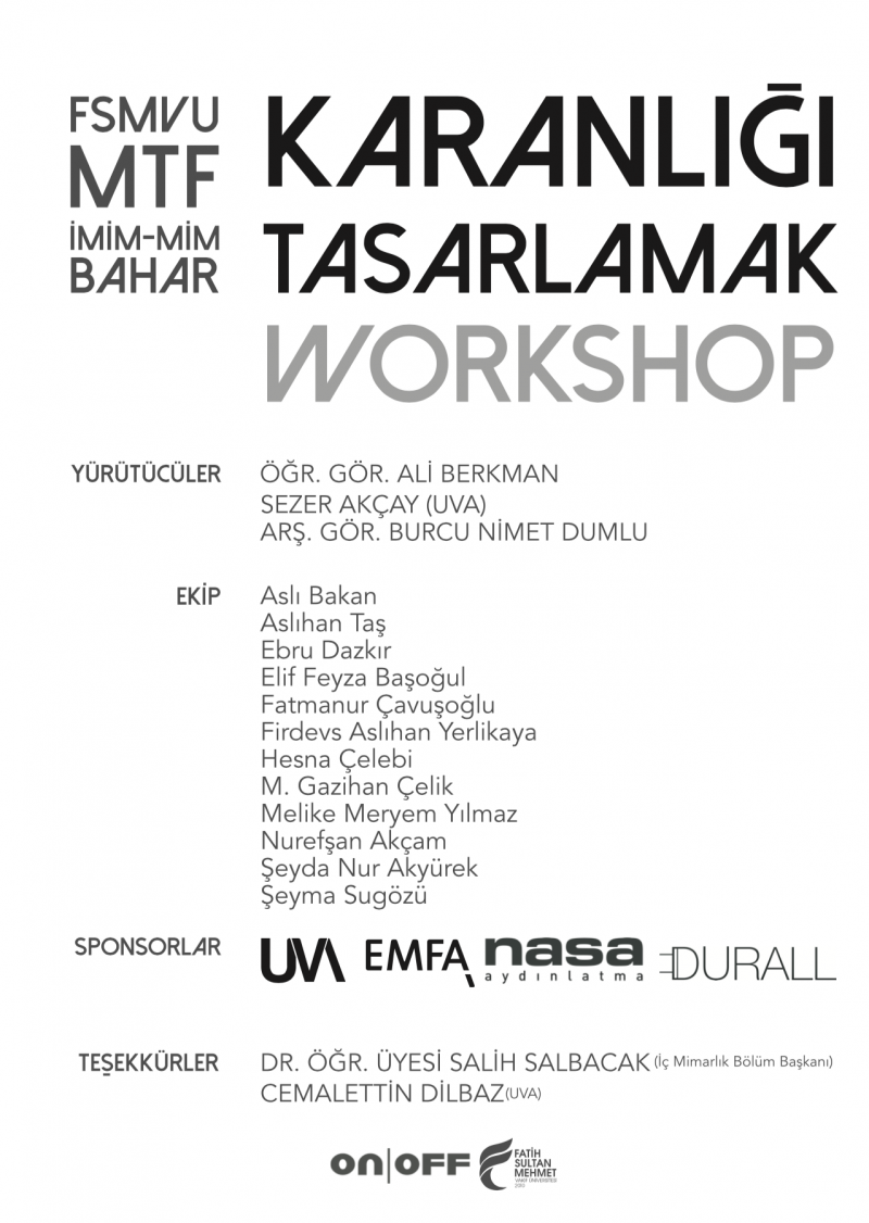 Mimarlık ve Tasarım Fakültesi 2018-2019 Bahar Yarıyılı Etkinlikleri kapsamında Öğr. Gör. Ali Berkman, UVA Yöneticilerinden Sezer Akçay ve Ar. Gör. Burcu Nimet Dumlu yürütücülüğünde 'Karanlığı Tasarlamak' çalıştayı gerçekleştirildi. 23 Mart 2019 Cumartesi günü Haliç Yerleşkesinde öğrencilerin yürütücüler ve sponsorlar desteğinde tasarladıkları peyzaj aydınlatması yerleştirildi.